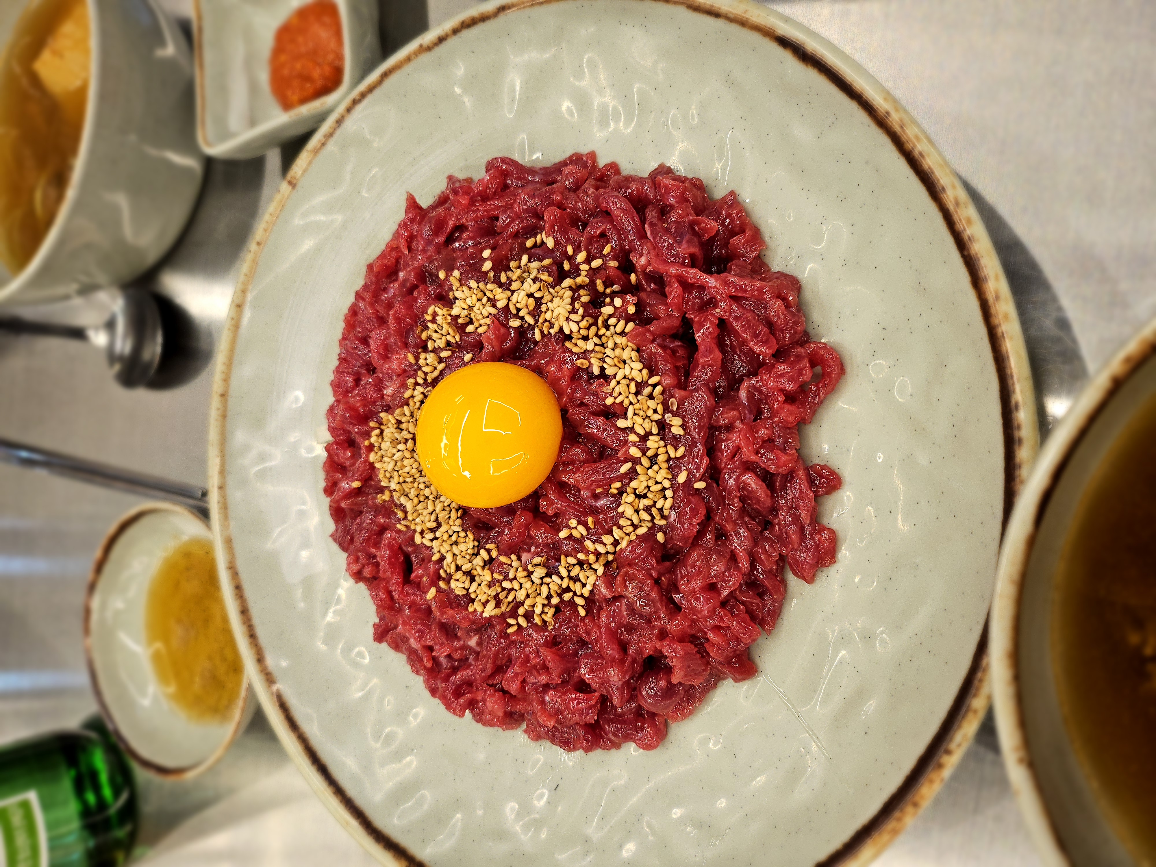 육회집은 어디든 사람이 많아서 자리가 있는 곳으로 자리 잡았습니다. 광장시장의 불편함이라고 한다면 테이블이 너무 좁아서 편히 먹는 곳은 아니란 생각은 항상 드는 것 같아요. 그렇지만 먹는 걸 포기할 순 없으니 자리가 나면 바로 앉아야 하는 건 어쩔 수 없죠. 육회는 비린맛은 전혀 없고 부드럽게 씹히는 촉촉한 느낌이었습니다. 달걀노른자를 터트려서 육회와 같이 비벼서 먹으면 고소함맛과 풍미가 배가 됩니다.