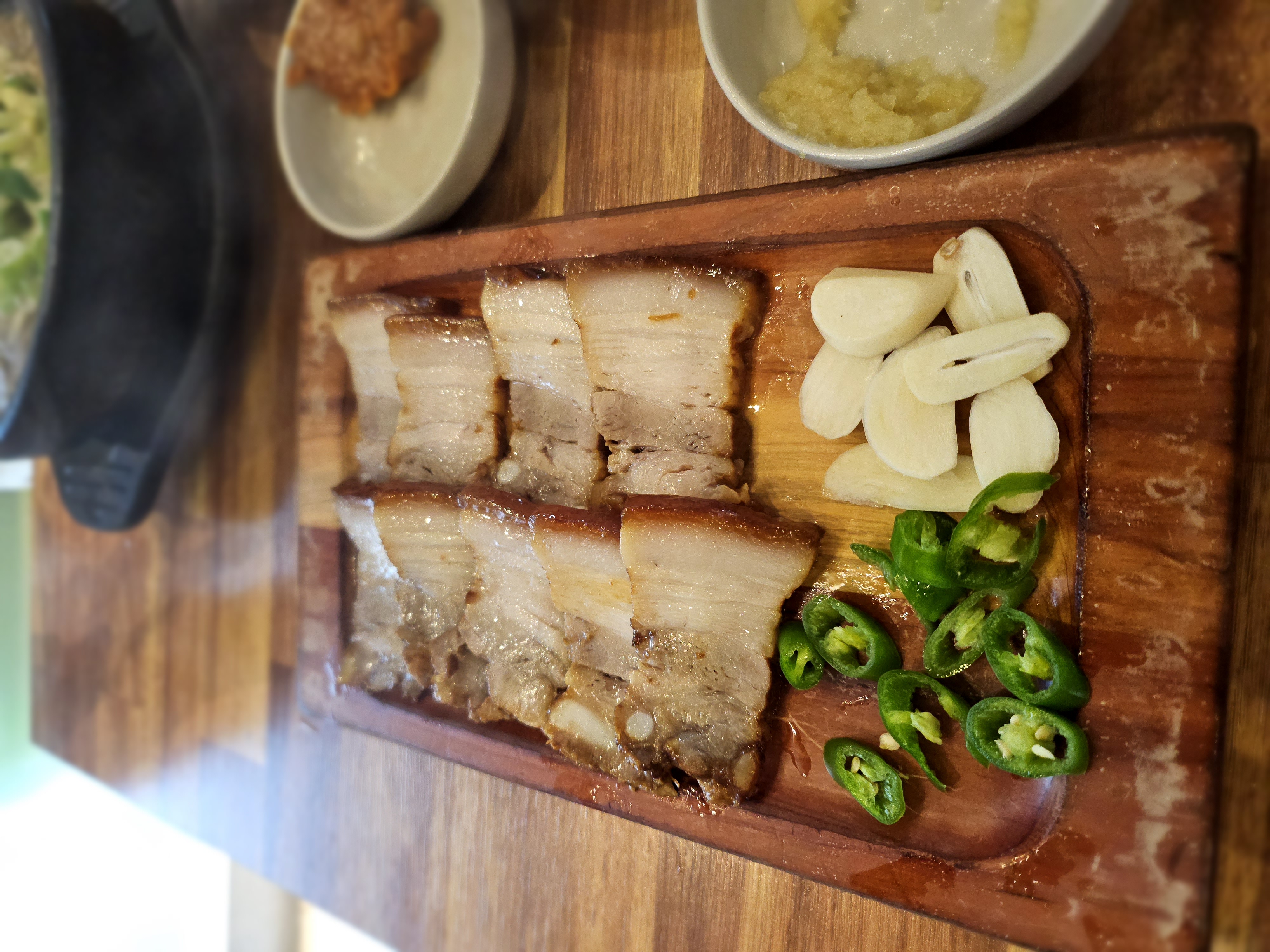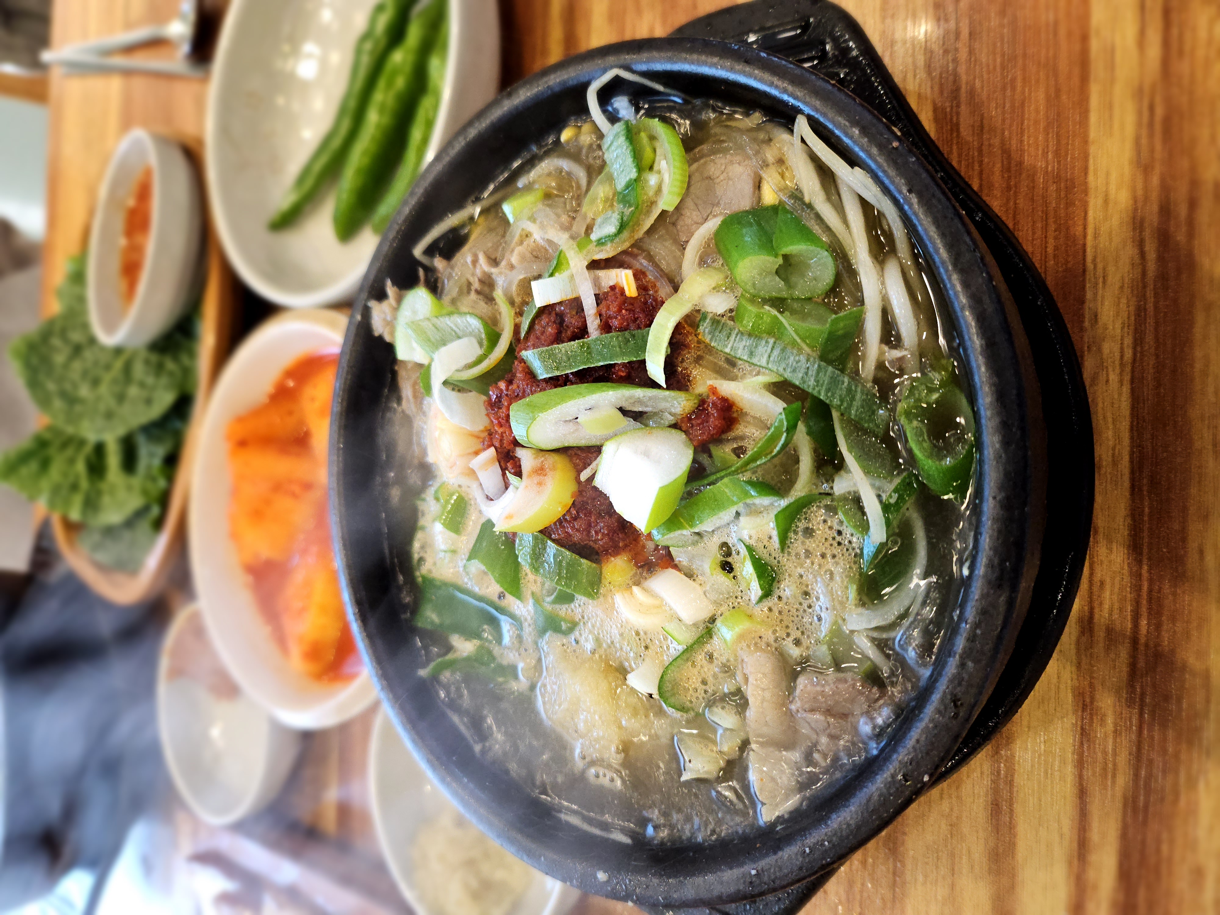 해장국이랑 돔베고기 작은 걸로 주문했습니다. 뚝배기째 팔팔 끓여서 나왔는데 보는 순간 속이 확 풀리는 느낌이었어요.